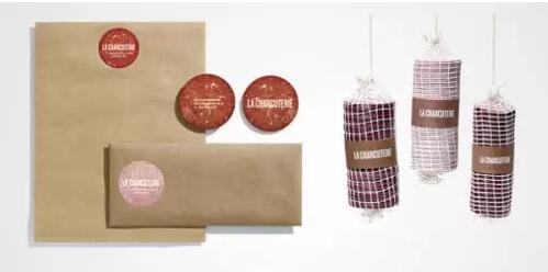 9. 加拿大温哥华La Charkuterie熟食店名片。La CHARCUTERIE是加拿大温哥华一家熟食店。名片设计看起来像冷盘,然后串成网类似的方式像腊肠和其他腌肉一样挂熟食店。