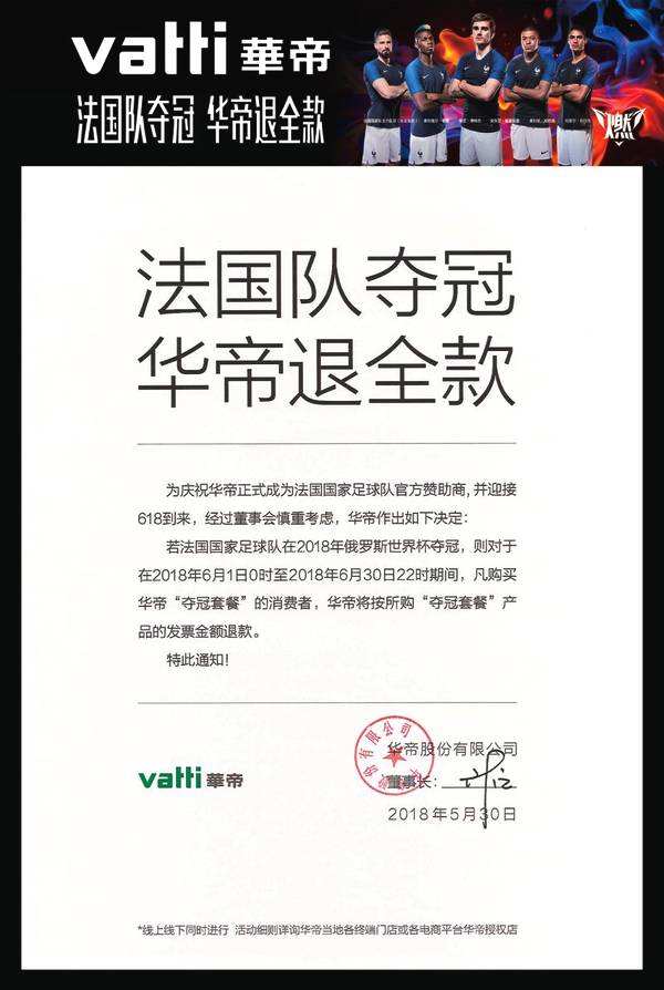 而华帝利用这次世界杯热点和618购物节精心策划了一次事件营销。华帝在世界杯即将开赛前的天猫618活动上发布了一份全网通知并且由华帝总裁亲笔签名,法国队夺冠华帝退全款。