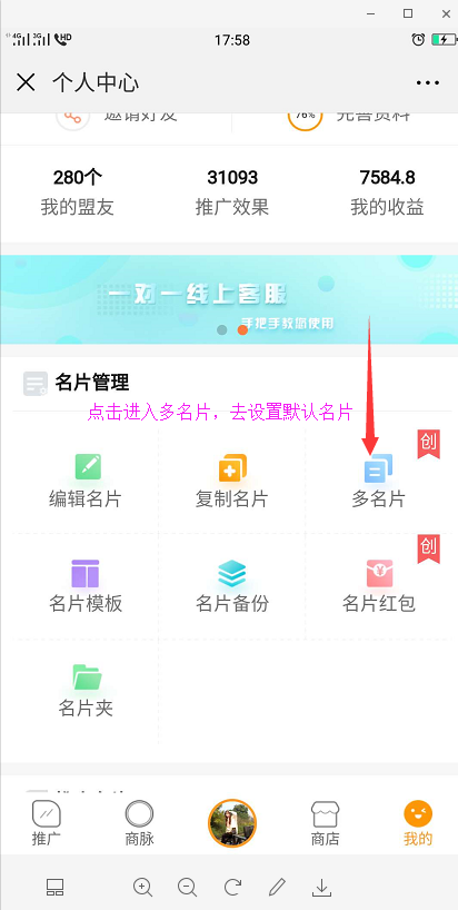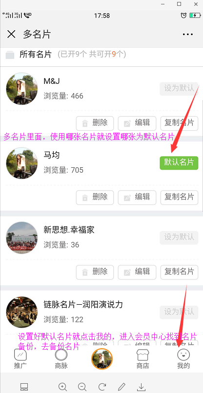 二:在多名片中选择需要使用的名片设置为默认名片,当前名片就是您默认的那张名片,默认好了再点击右下角的我的进入会员中心页面。(看图操作)
